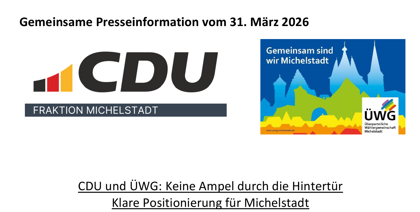 Gleichzeitig kündigen CDU und ÜWG an, konstruktiv an Lösungen für Michelstadt mitzuwirken: „Wir werden dort zustimmen, wo Maßnahmen sinnvoll sind, und klar benennen, wo wir andere Wege für richtig halten – sachlich in der Argumentation und fair im Ton.“